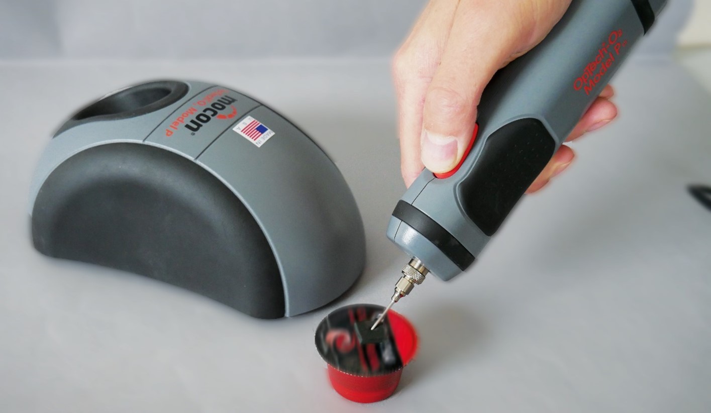 OpTech-O2 Model P being used to conduct headspace gas analysis of a coffee K-cup, as part of a shelf life study..