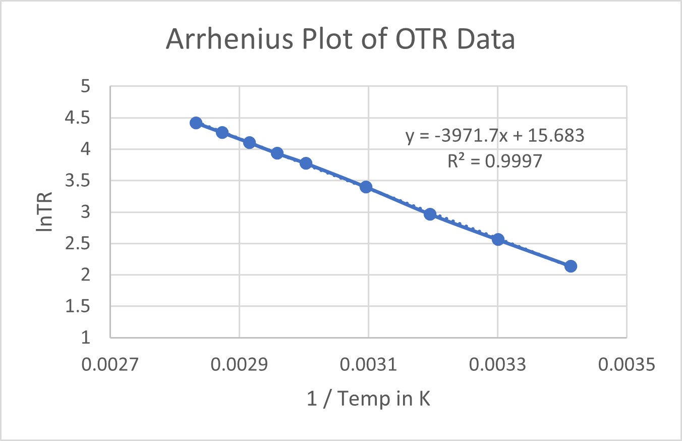 By graphing this relationship, we can estimate the transmission rate at other temperatures. However, the curved nature of this relationship makes it difficult to accurately predict transmission rates. As often seen with other reactions in nature, this temperature and transmission rate data follows an Arrhenius relationship. Graphing the data with an Arrhenius plot (lnTR vs 1/Temp K) can be a powerful predictive tool if the data demonstrates a straight line. When this occurs, using the linear equation of the line, one can calculate the OTR for other temperatures.