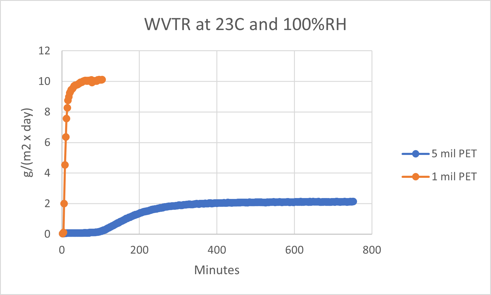 In this example the water vapor transmission rate (WVTR) for the 1mil PET film was 10.1 g/(m2 x day). The time required to reach 95% of this value was under 30 minutes. The 5mil PET film had a WVTR of 2.17 g/(m2 x day) and required nearly 450 minutes to reach 95% of the final value. We commonly see that the last 5-10% of TR equilibrium can take a relatively long time for thick samples, especially when measuring higher barrier materials.