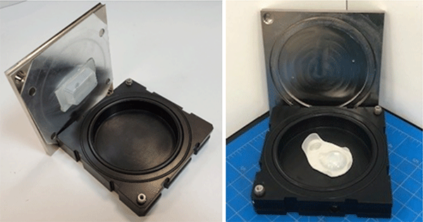 The new custom cup cartridge design allows technicians to secure a test cup by a compressive force for any cup diameter within approximately 3.5” (you can design a test for larger specialized cups as well). Since injection molded cups have flanges, the cartridge top plate with a protruding lip that has the same diameter as the cup compresses the flange area when being secured to the base (figure 2). Multiple-sized cups only need a custom top plate to match the flange diameter while utilizing the same cartridge base (figure 3). This easily facilitates testing of various cup sizes using the same cartridge base (i.e., 80 cm2 cartridge base).