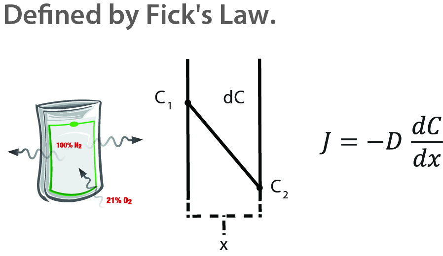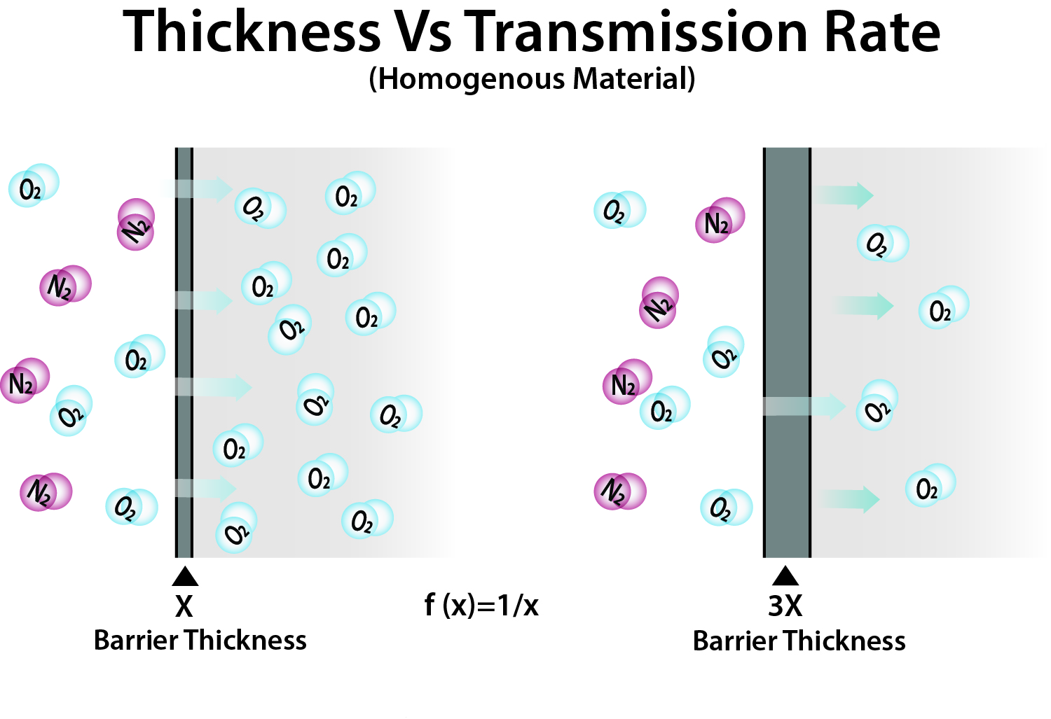 The diffusion rate of molecules through a material is inversely proportional (1) to the thickness of the material. Thicker walls increase the permeation path link, forcing permeant molecules to transverse a longer distance, which slows down the diffusion process. For homogenous materials, there is also a relationship (2) between wall thickness and test time to reach equilibrium; directly impacting QC testing throughput.