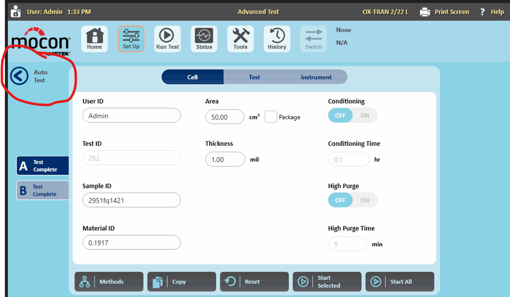 You can access the AutoTest function from the Test Setup screen by selecting the arrow on the left side. For more information, contact your local MOCON representative.