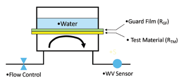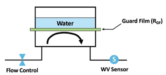 - Apparatus: A diffusion cell is created using a dry chamber (with flowing nitrogen gas), guard film, and a wet chamber. With water against the guard film, this allows for the delivery of extremely high humidity to the Test Sample, while not physically wetting the sample’s surface. The dry nitrogen carrier gas flowing through the chamber is routed to a water vapor sensor.